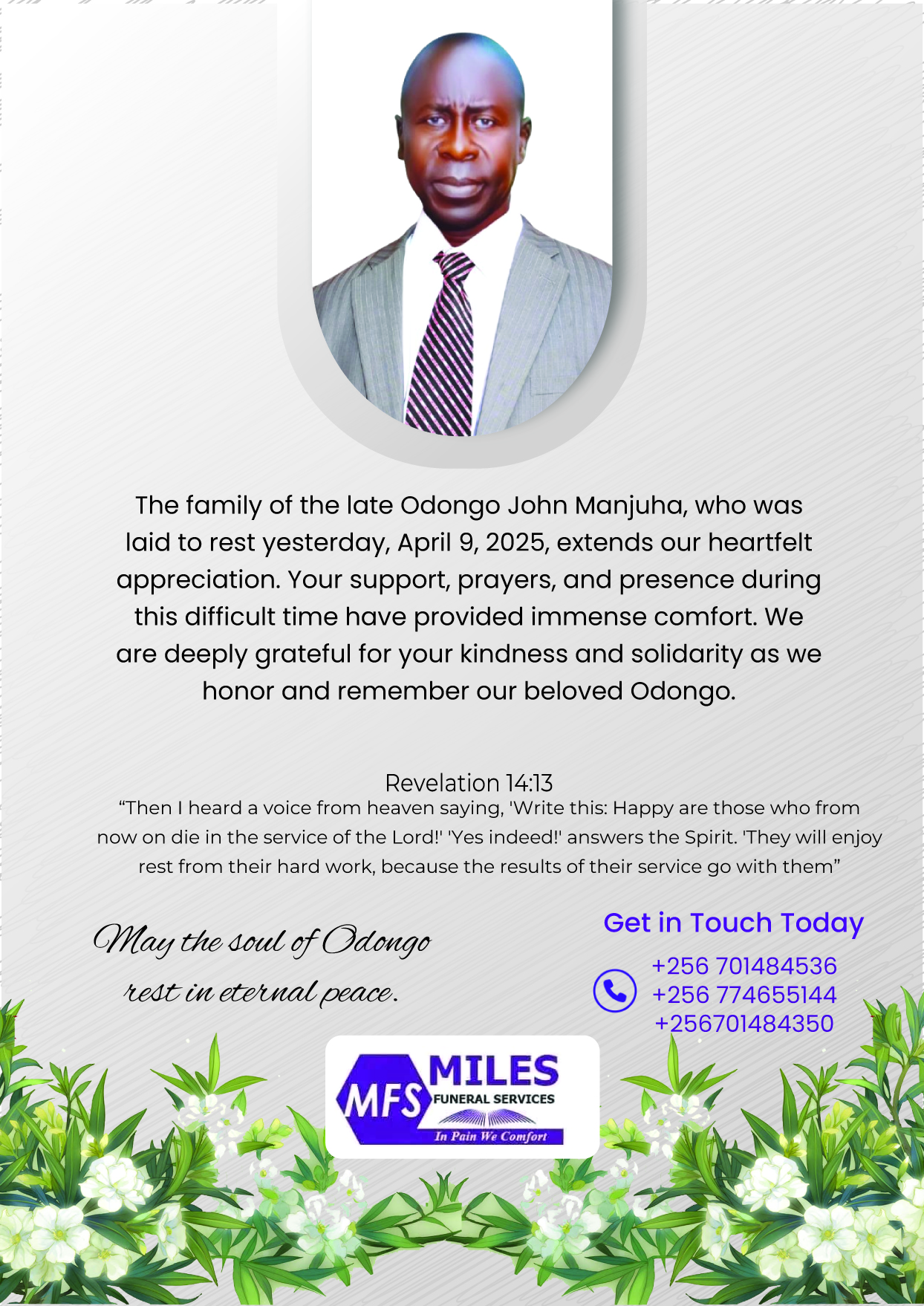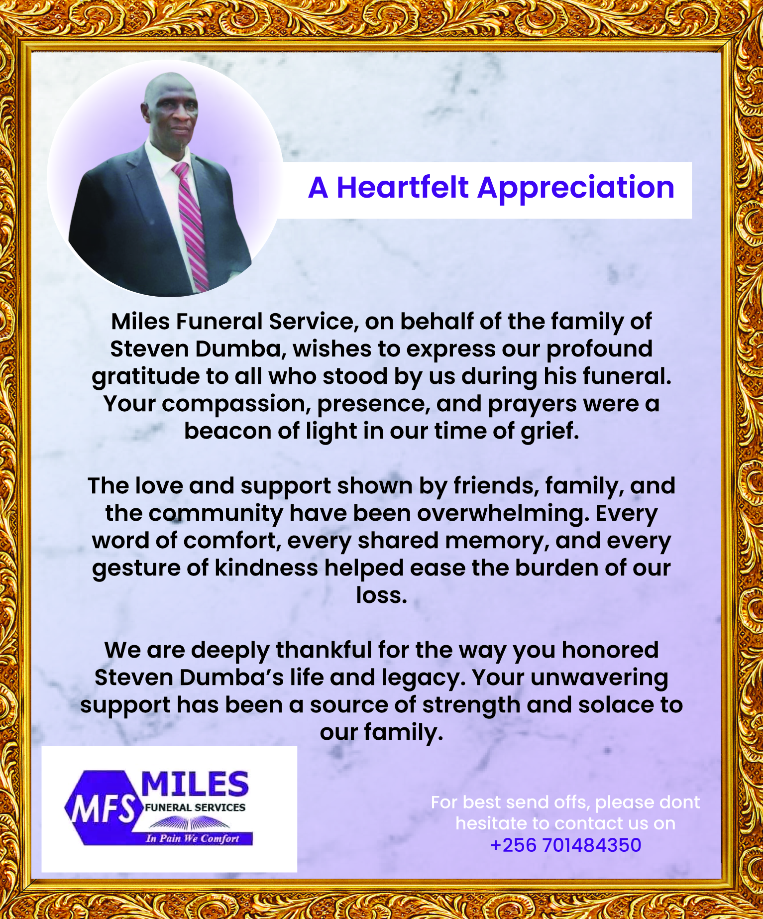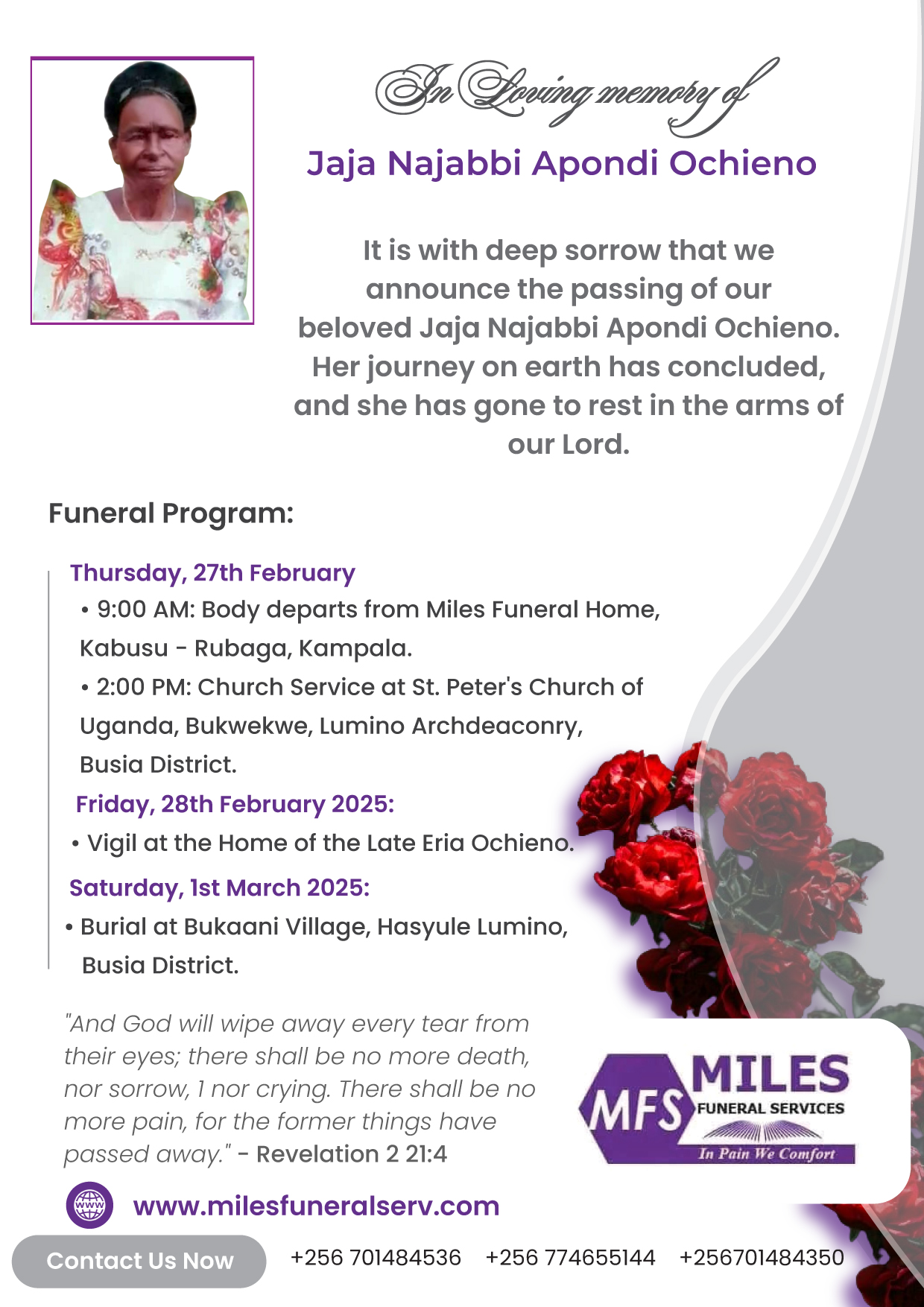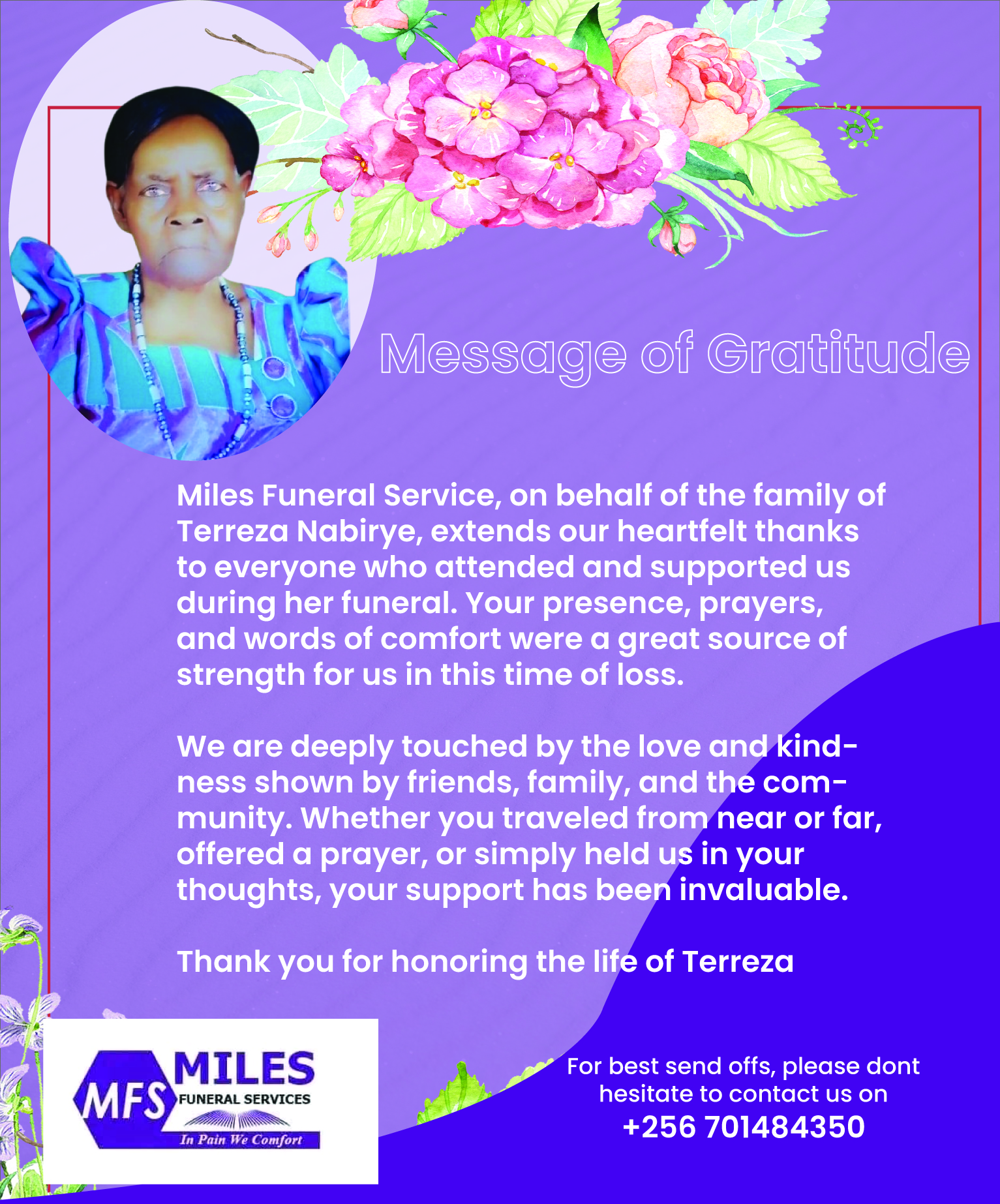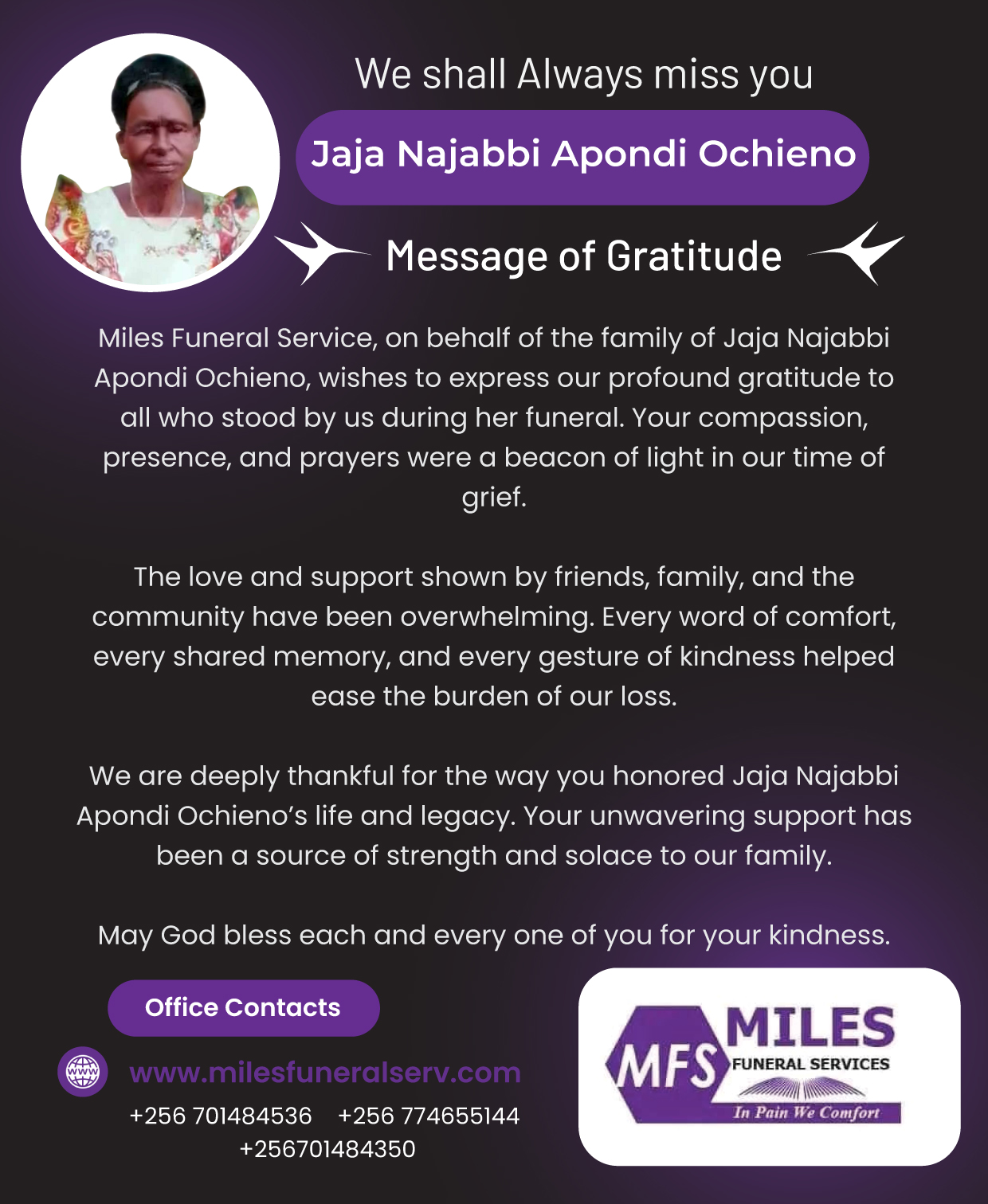 We are a professional funeral service provider in Uganda, offering compassionate support, dignified farewells, and tailored funeral arrangements. From transportation to burial and memorial services, we guide families through every step with care and respect. At Miles Funeral Services, we comfort you in pain and honor your loved ones with dignity.